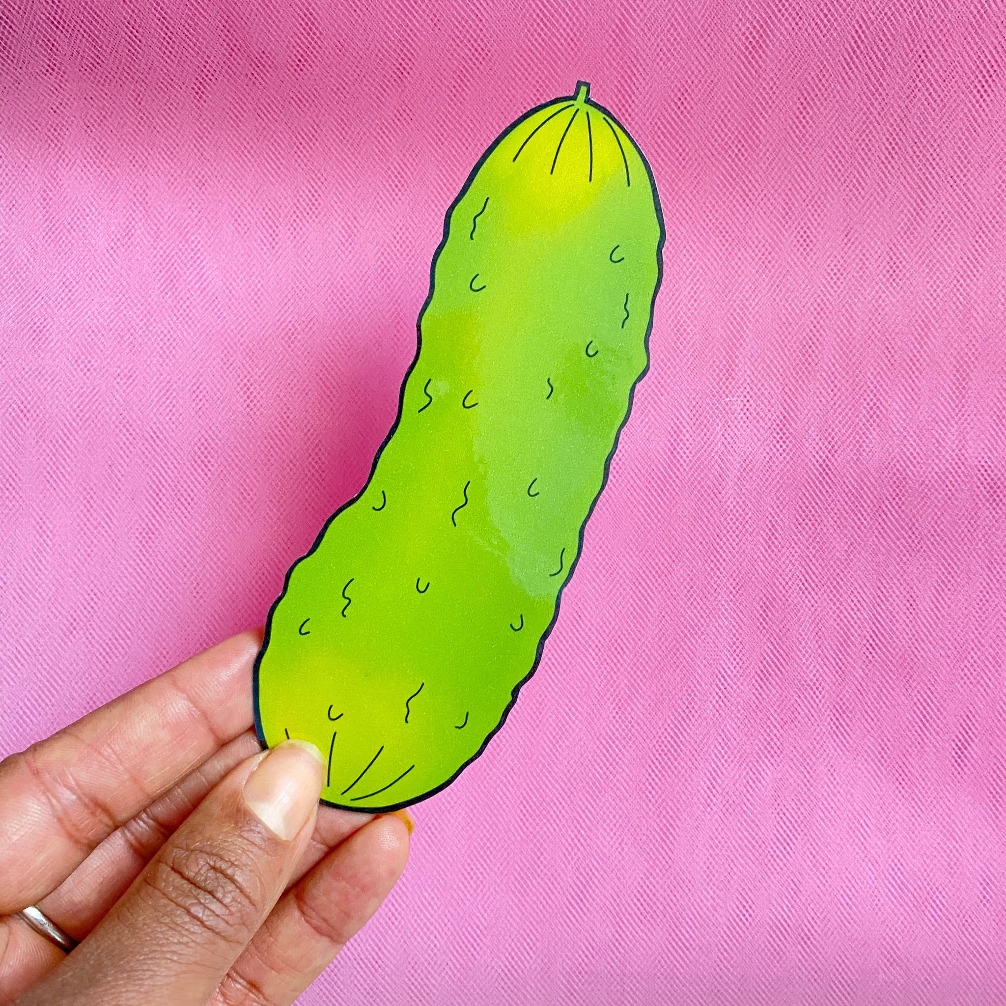 It's a Pickle Bookmark to stick in your book! ⚡ Includes one (1) bookmark ⚡ Bookmark measures approx. 2.25" W x 6" H ⚡ Printed on 100lb cover smooth cardstock ⚡ Double sided ⚡ Hand cut Bookmarks ⚡ Each Bookmark is laminated for protection and extra sturdiness. ⚡ Weatherproof, but not Waterproof ⚡ Each bookmark is shipped in a cello bag. ⚡