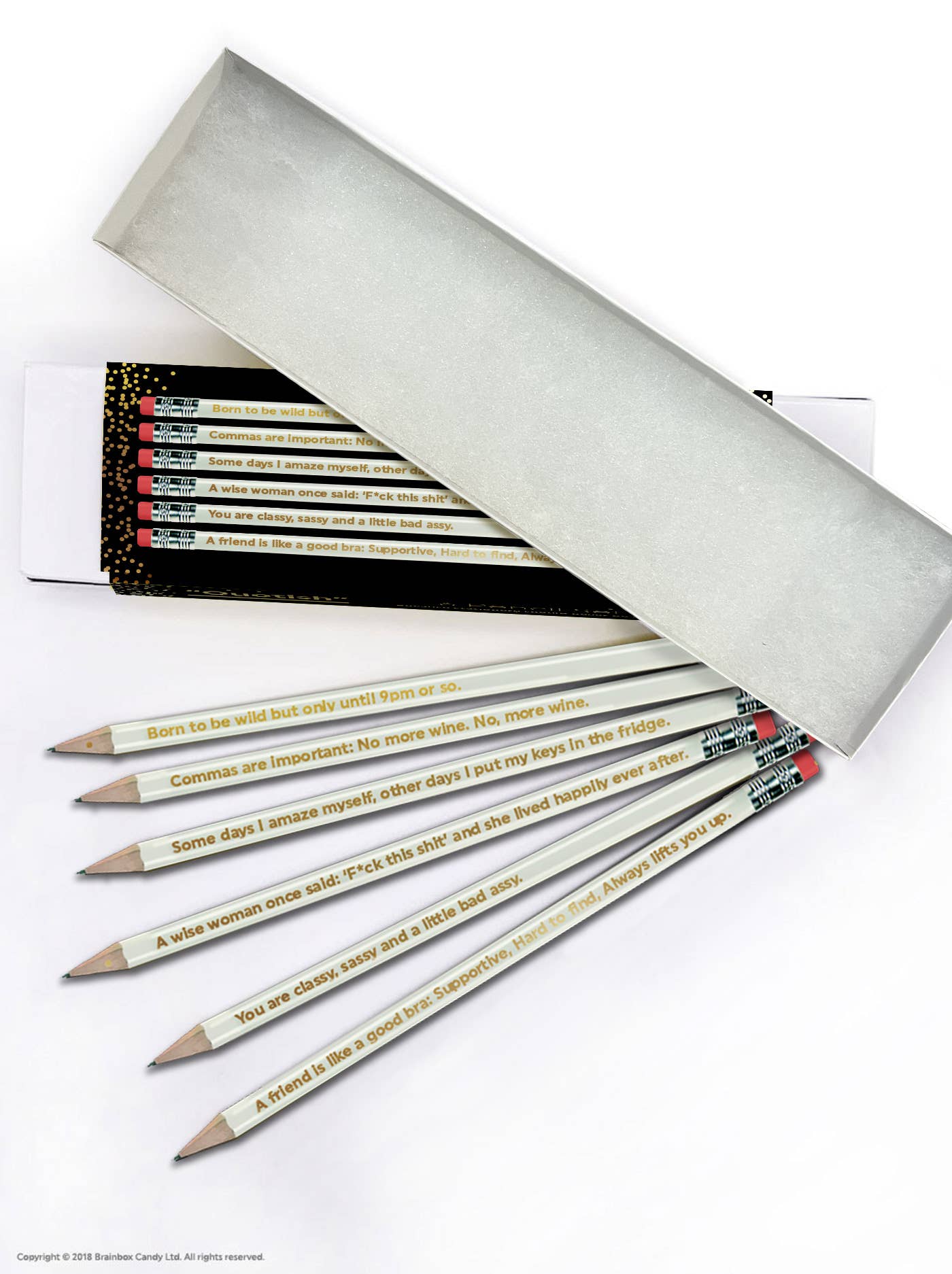 These cheeky Pencil Sets feature seven expertly crafted white and gold pencils, each adorned with a humorous slogan. Encased in a sleek and stylish gift box, this unique set makes for the perfect gift for anyone with an appreciation for quirky humour. Crafted with care and precision in the UK, each pencil features a smooth HB graphite core and an eraser. Supplied in: Packs of 6 Dimensions: 207mm x 55mm Weight: 100g
