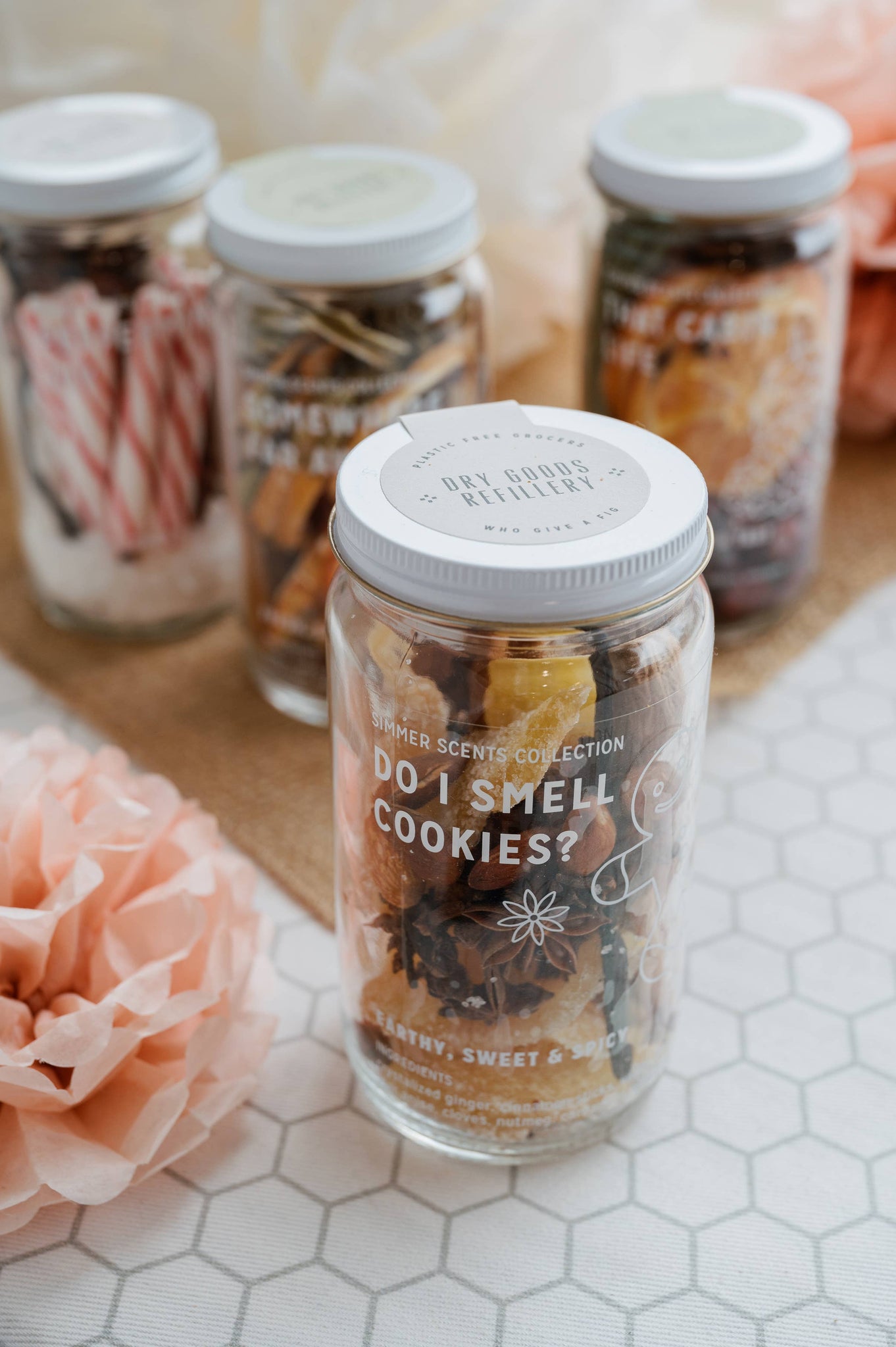 Our sustainable pot simmers are filled as part of our plastic free, zero waste grocery in Montclair, NJ. Simply pour the contents of the jar into a pot of water and simmer on low. Your home will be filled with the smells of Gingerbread Cookies.